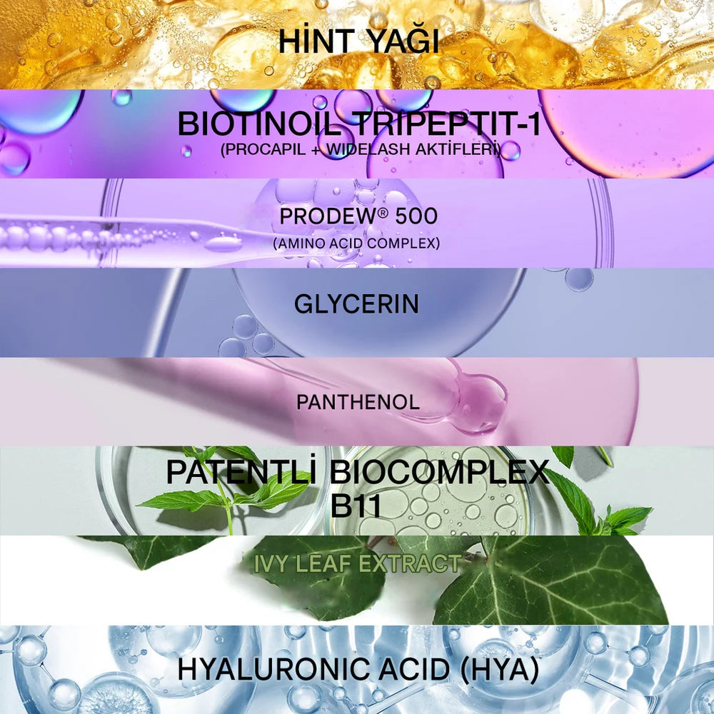 Bioxcin Eyebrow and Eyelash Serum nourishes, thickens and supports the growth of your eyebrows and eyelashes thanks to the hedera helix (ivy leaf) extract, BioComplex B11, hyaluronic acid, Biotinoyl Tripeptide-1, hydrolyzed collagen, castor oil, glycerin, vitamin B5 and PRODEW 500 (Amino Acid Complex) it contains.
